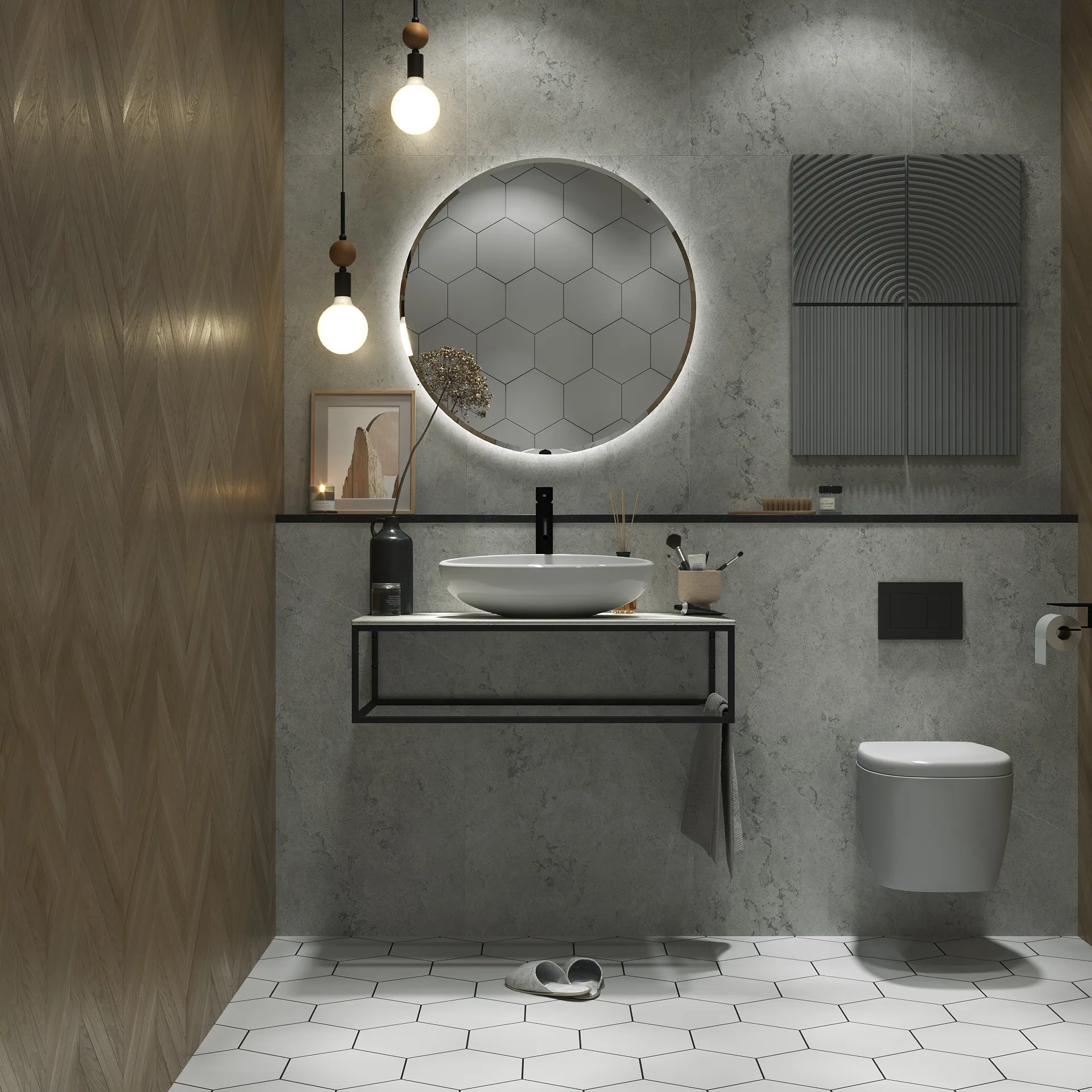 Столешница из керамогранита - это стильное, функциональное и долговечное решение, которое подойдет для ванных комнат, исполненных в самых разнообразных отделочных материалах. Такая универсальность, тем не менее, предполагает высокую декоративную и эстетическую ценность столешницы - она делает обстановку в ванной комнате по-настоящему стильной и соответствующей актуальным тенденциям в дизайне. Металлическое подстолье создает эффектный цветовой контраст, а также может использоваться в качестве практичных рейлингов для удобного размещения полотенец и банных халатов.