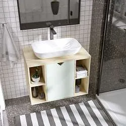 • Материал фасада – МДФ, облицованная матовой пленкой ПВХ, светлый деревянный корпус из влагостойкой ЛДСП. Благодаря этому тумба надолго сохранит первозданный вид в условиях повышенной влажности ванной комнаты.