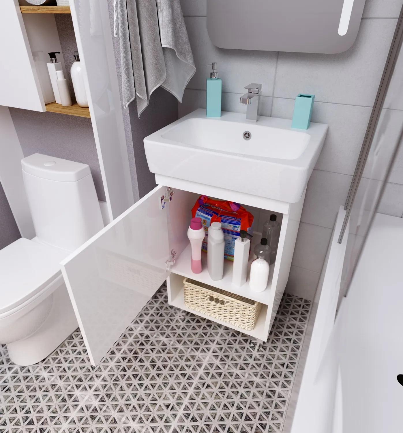 Практичная тумба с многофункциональной конструкцией. Практичная ручка закрывающегося шкафчика может использоваться как держатель для небольших полотенец. Лаконичная конструкция и минималистичный дизайн без лишних деталей делают эту тумбу подходящей для интерьера ванной комнаты в любой стилистике. Она будет одинаково уместна как в классических сдержанных пространствах, так и в современных или даже эклектичных комнатах, оформленных на стыке разных стилей.Характеристики: