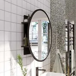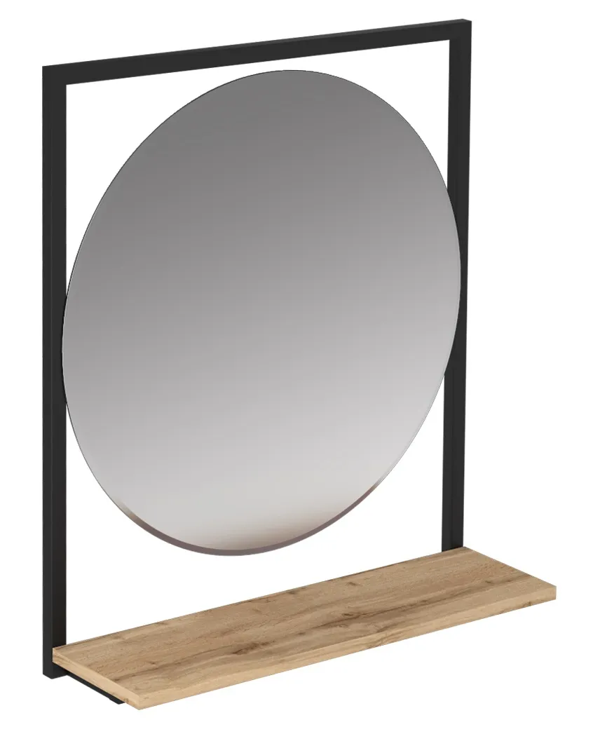 Стильное зеркало, дизайн которого построен на игре контрастов. Его декоративная рама контрастного цвета выполнена в форме прямоугольника, а само зеркало - в форме круга. Такое сочетание превращает обычный аксессуар в эффектную декоративную инсталляцию, служащую прекрасным украшением окружающего пространства. Его дополнительное преимущество состоит в компактной, но вместительной полочке, которая максимально удобна для хранения косметики и других личных вещей. Полочки покрыты акриловым лаком, устойчивым к влаге, что позволяет изделию сохранять свой первоначальный внешний вид долгие годы.